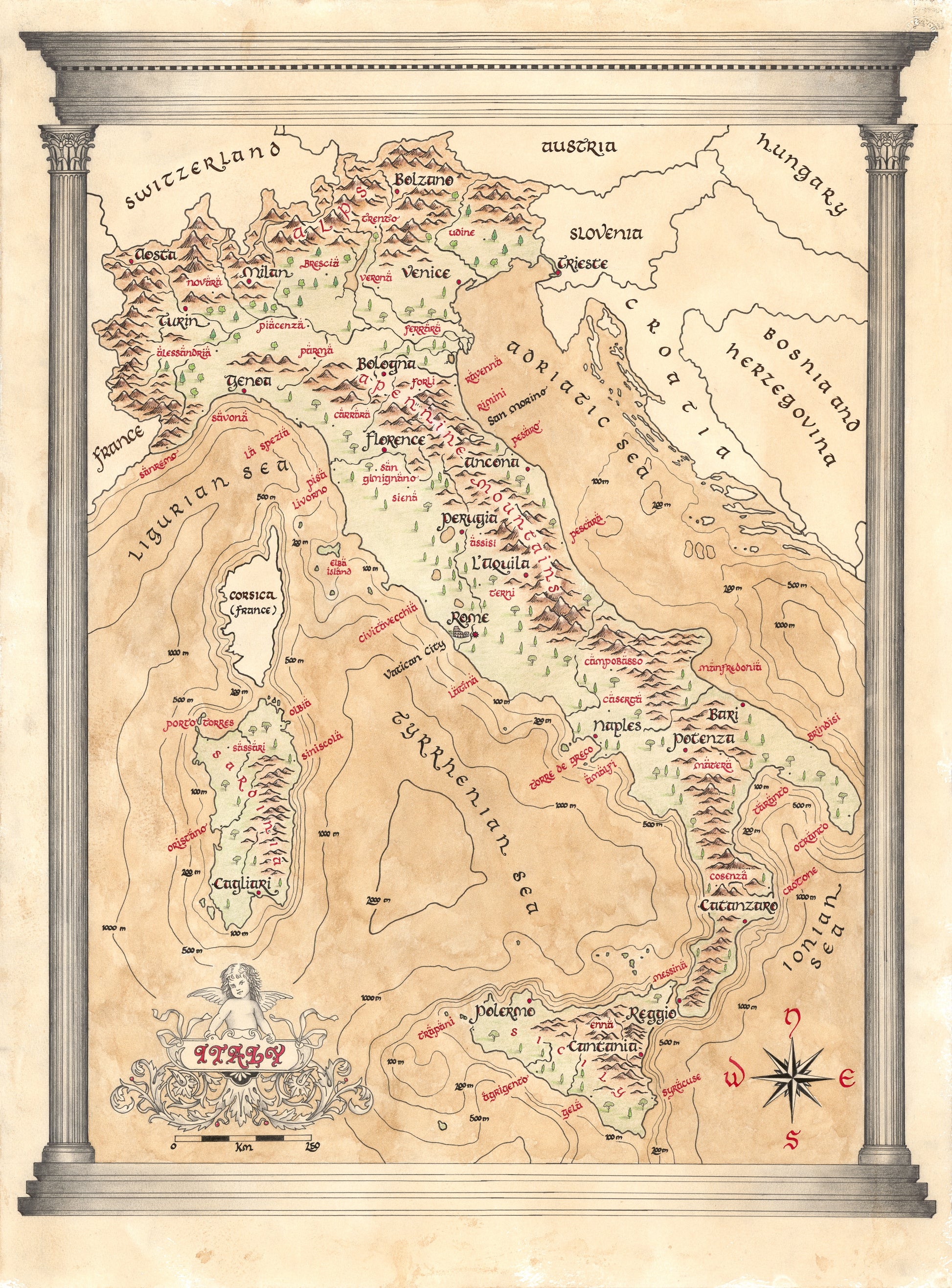 This map of Italy was crafted when Jordan arrived back from a month long exploration of Europe. He was inspired by the art culture and wanted to recreate a similar feeling in his own way. He crafted Italy with inspiration he say in Venice with pillars as the border. The cartouche features a small angel child that is a hint to Michelangelo and the Sistine chapel. One of Jordans first Originals.