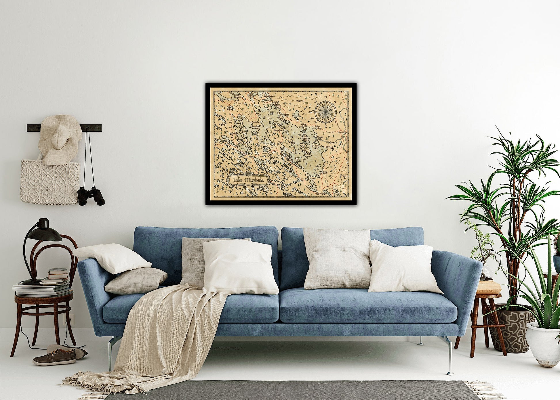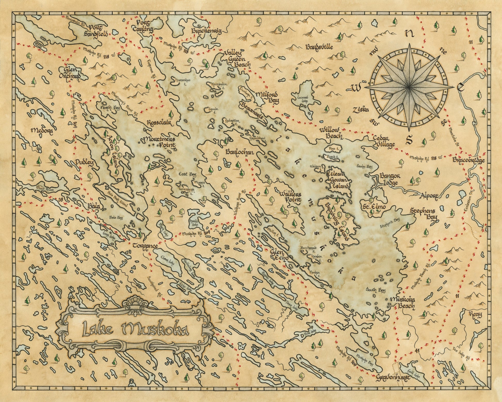 This hand-drawn map of Lake Muskoka in a vintage Tolkien inspired design brings the area to life with mythical detailing. Part of a three piece series, it features winding shorelines, iconic points of interest, all rendered in an aged, fantastical style that evokes a sense of adventure and wonder.