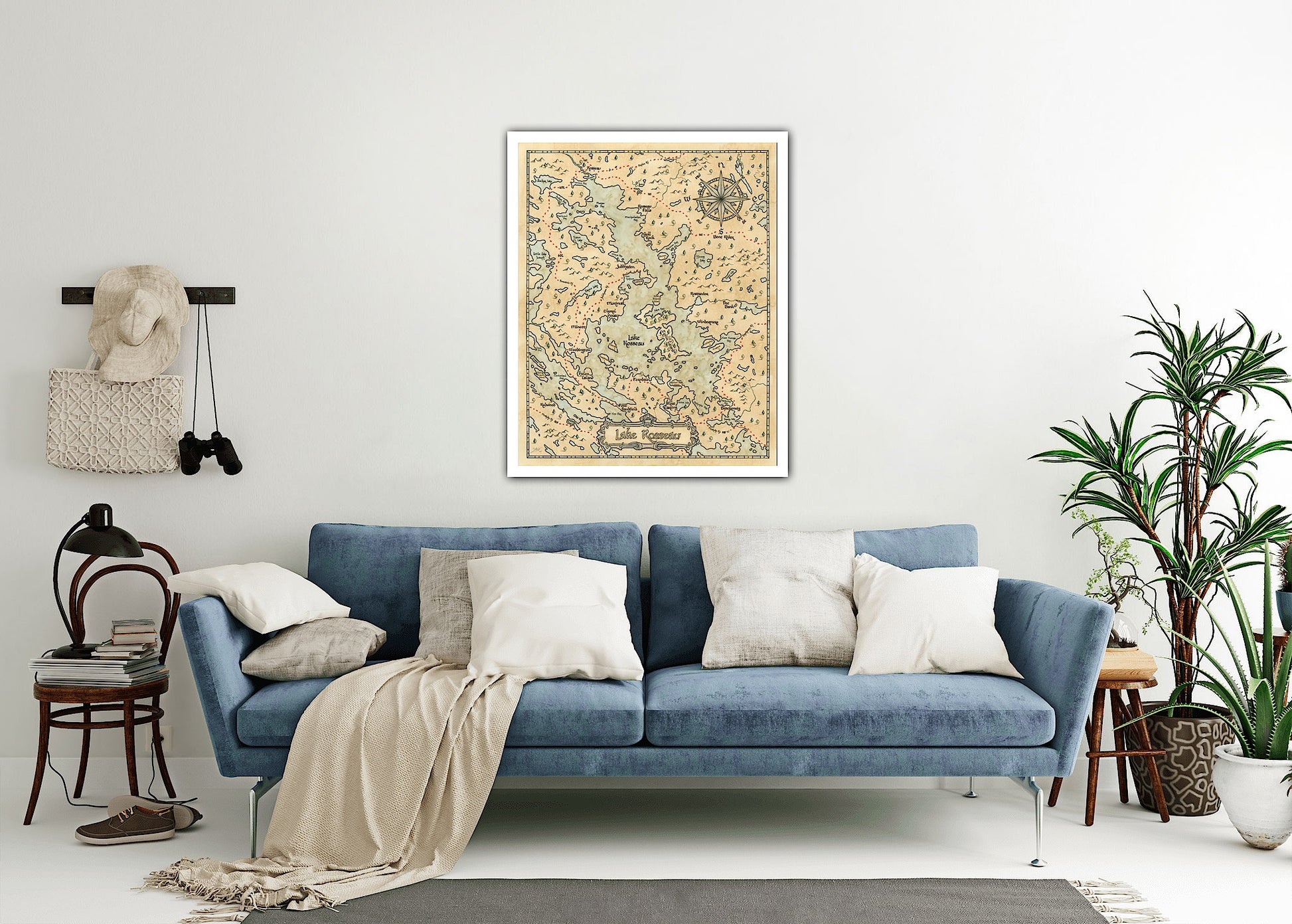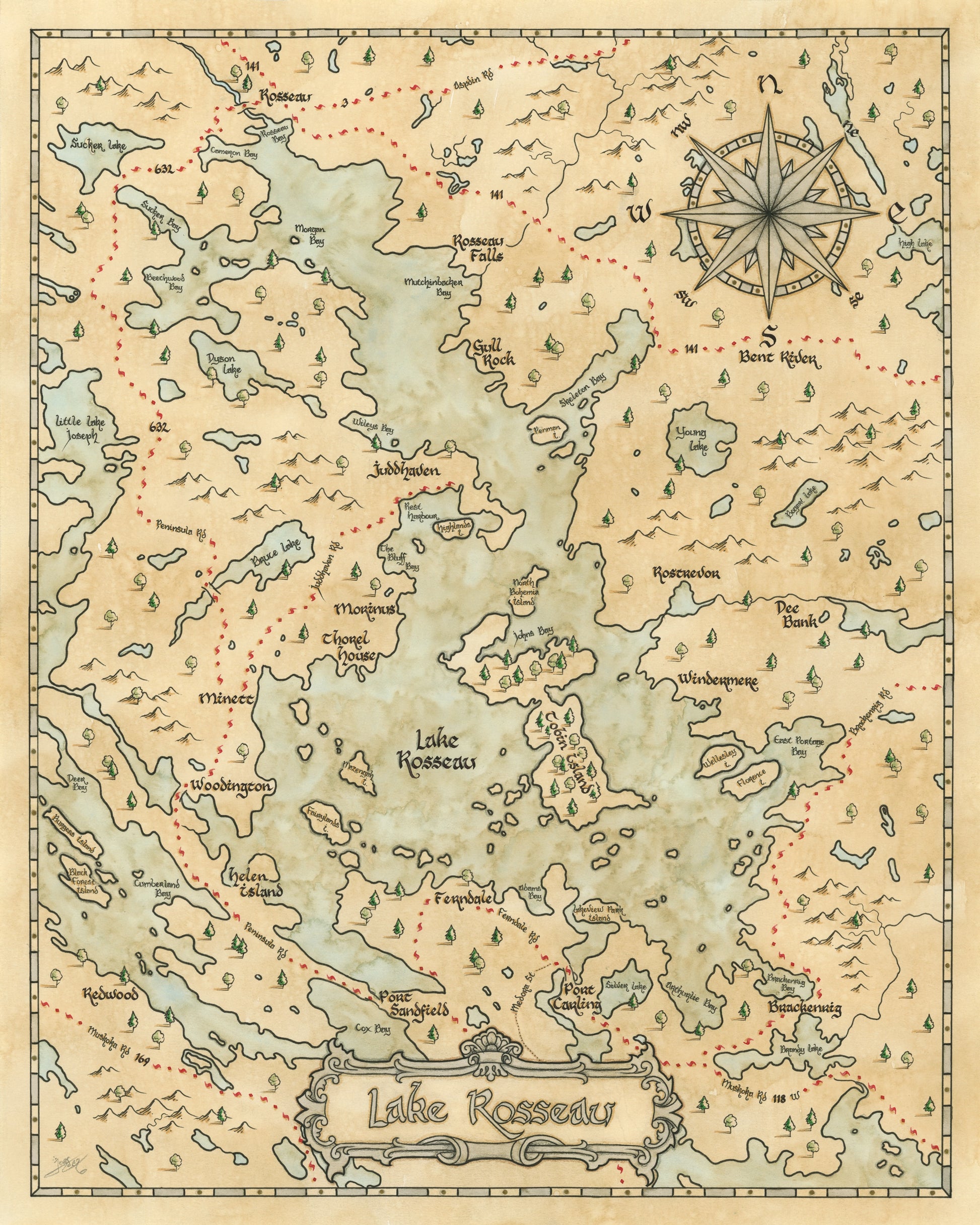 This hand-drawn map of Lake Rosseau in a vintage Tolkien inspired design brings the area to life with mythical detailing. Part of a three piece series, it features winding shorelines, iconic points of interest, all rendered in an aged, fantastical style that evokes a sense of adventure and wonder.