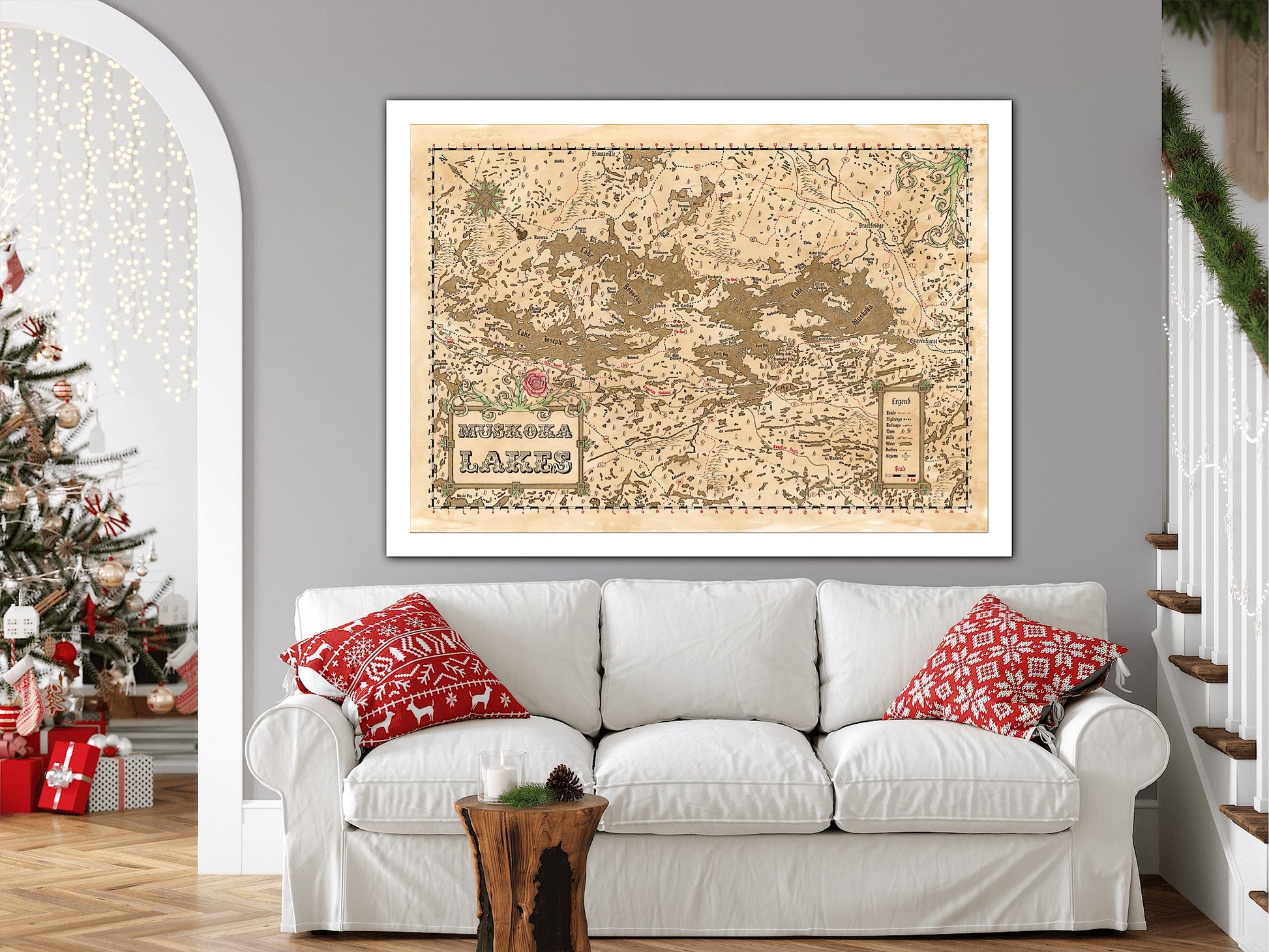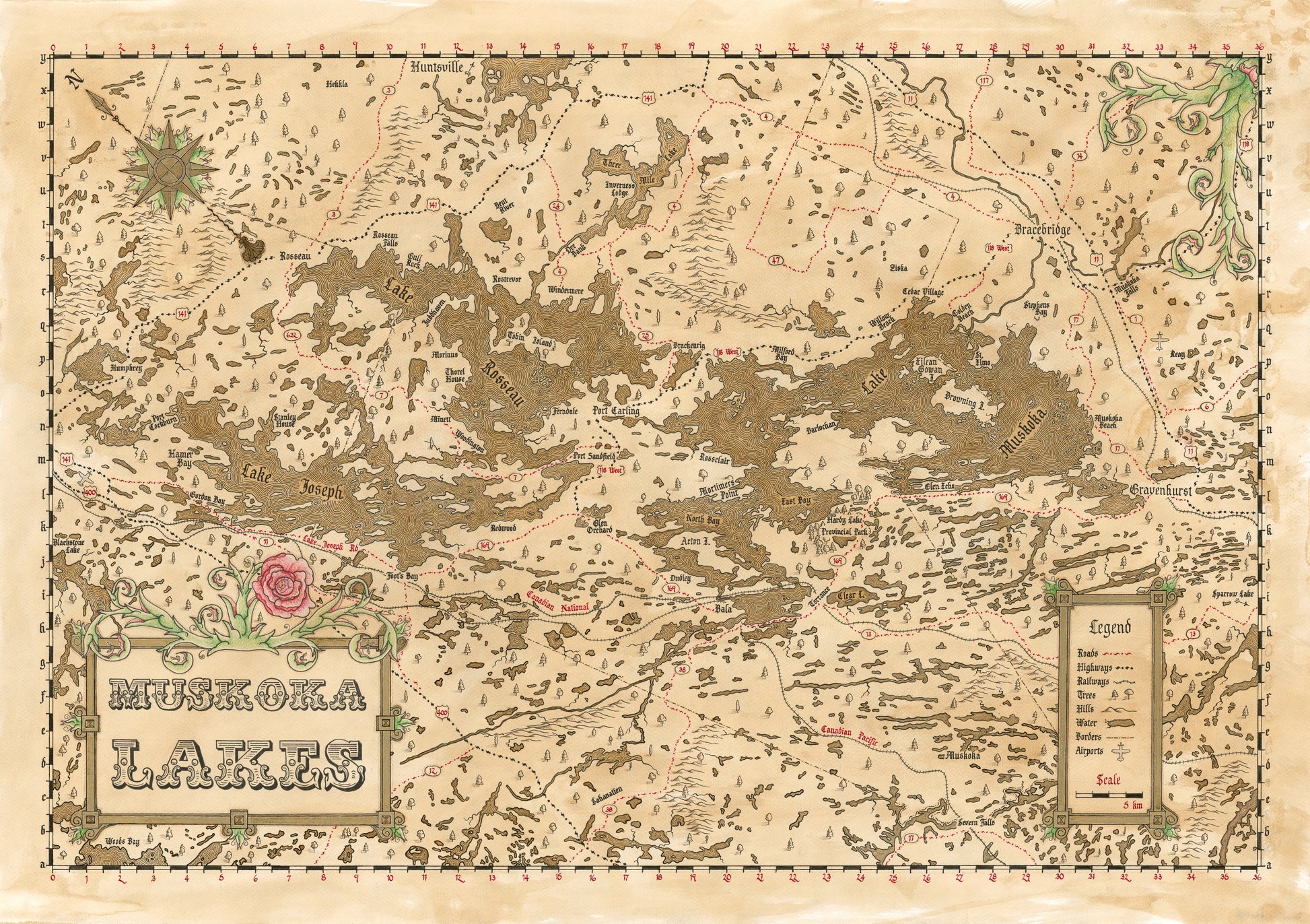 This map of the Muskoka Lakes was hand drawn with Passion and creativity. A stunning, one-of-a-kind piece of true Canadiana. Using an adventurous and artistic approach, the detailing includes calligraphy, landscapes, and vibrant watercolour.